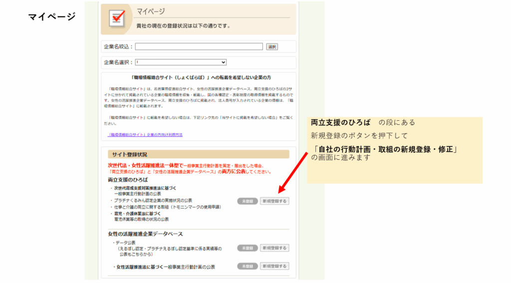 ②ログイン後、マイページから「自社の行動計画・取組みの新規登録・修正」に進む