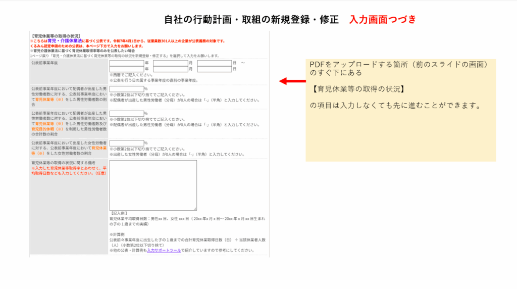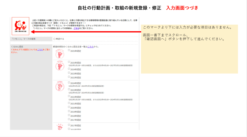 一般事業主行動計画の入力画面は、「くるみん認定申請」の画面も兼ねており、それにより非常に分かりづらくなっています。ですが、こちらは前述の「女性活躍推進法」に基づく一般事業主行動計画のためのものなので、新事業進出補助金の申請する上で以下の項目は入力する必要はありません。